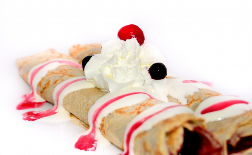 - Смажьте одну половину блинчика творожным сыром, сверху выложите ягоды и сверните рулетиками или конвертиками. Посыпьте пудрой или украсьте остатками крема и ягод.