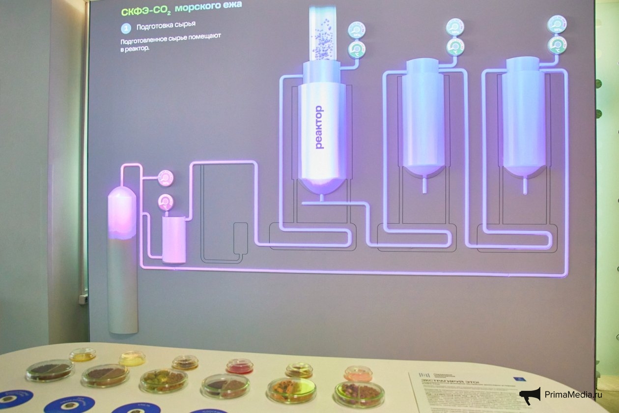 Установку разместили в самом начале экспозиции, сразу после инсталляции, посвященной "еде будущего". Экспонат наглядно демонстрирует один из самых загадочных процессов науки: от подачи измельчённого сырья в колбу до работы реактора и сепаратора, куда поступает поток углекислого газа. Даже добавляемый сорастворитель — всего несколько миллилитров — включён в демонстрацию, чтобы процесс выглядел максимально реалистично. Благодаря этому посетители могут полностью погрузиться в технологию и понять, как современные методы "зелёной химии" превращают сырьё в полезные экстракты.