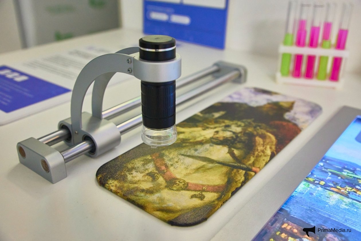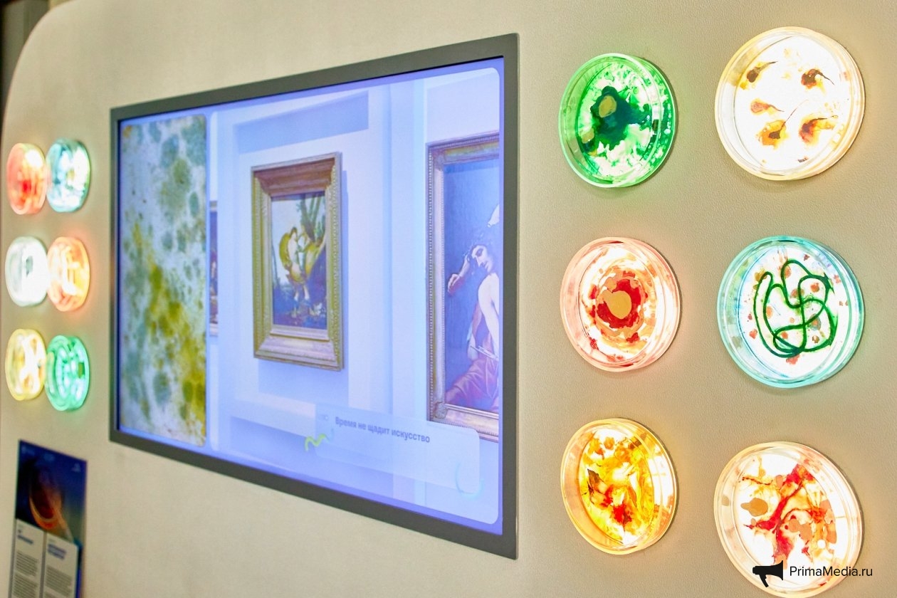 Раньше реставрация картин занимала годы и требовала применения скребков и агрессивных растворителей. Сегодня же часть этих процессов можно выполнять с помощью специальных антибиотиков. В качестве примера в экспозиции представлена картина владивостокского пейзажа от местного художника Артёма Малыгина. Посетителю предлагается выбрать одну из трёх работ и провести небольшой эксперимент: попробовать "очистить" изображение традиционным растворителем или же использовать современный биотехнологический метод. Это не просто игра — это наглядная демонстрация того, как наука помогает в сохранении искусства.