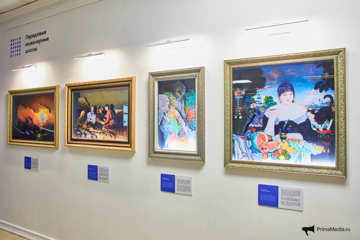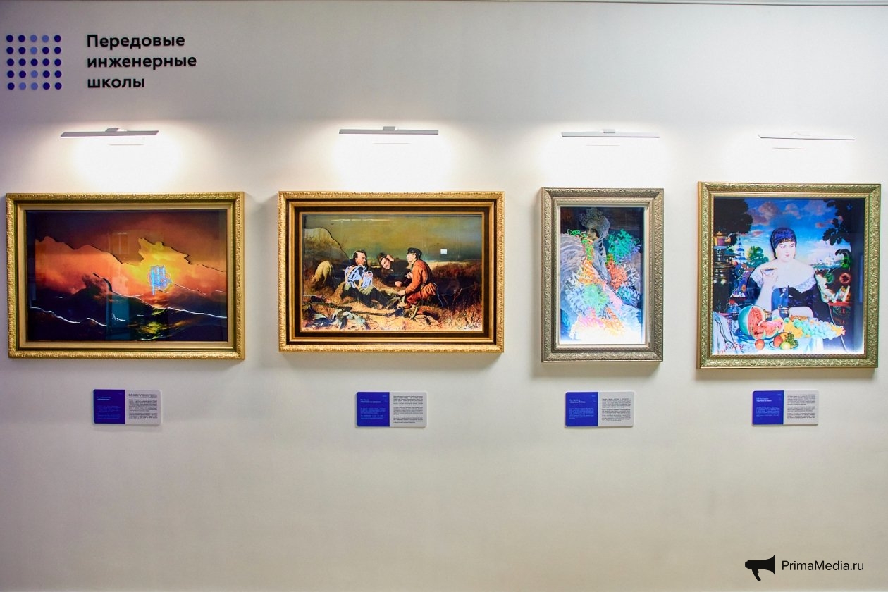 Отдельного внимания заслуживает фотозона: задник, выполненный в стиле "Третьяковской галереи", представляет собой четыре объёмные картины с интегрированными белковыми структурами. Перед ними предусмотрено место, где посетители могут сделать эффектные фотографии.