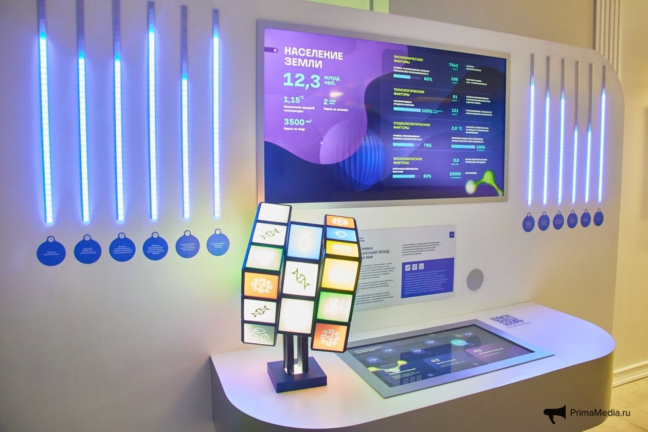 Отдельного внимания заслуживает стенд "Как биоэкономика изменит мир". Он представляет собой хронологическую шкалу устойчивого развития — от 2000-х до 2100 -х годов — и наглядно демонстрирует, как стремительно меняется структура мировой экономики под влиянием биотехнологий. Если, допустим, в 2021 году "зелёные" технологии в промышленности только начинали свой путь: при населении Земли более 7,7 млрд человек их проникновение не превышало 1,5%. Альтернативные продукты питания занимали всего 2% мирового рынка, а переработка пластика застыла на отметке 9%. То, согласно прогнозу, уже к 2030 году ситуация изменится кардинально.