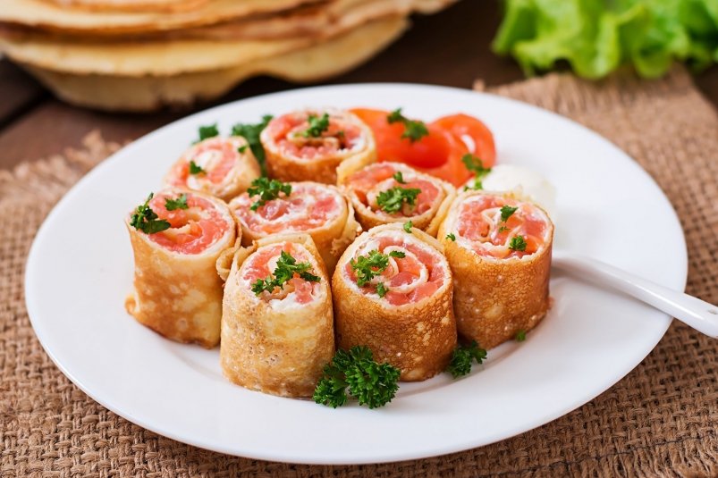 Вкусные, нежные, сочные блинчики с красной рыбой готовы! Получается невероятно вкусно — настоящий деликатес для праздничного стола! Приятного аппетита!