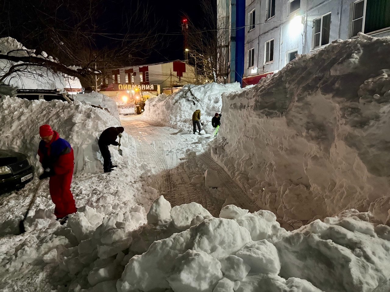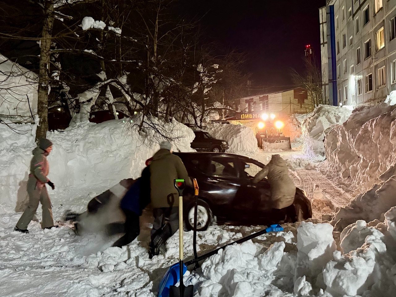 Обычный двор в Петропавловске-Камчатском. Последний раз снег убирали в середине декабря. После всех циклонов проезд полностью заблокирован уже две недели. Невозможно вывезти мусор, проехать пожарным и скорой, подвести товары в окрестные магазины. Попытка погрузчика пробиться в соседний двор закончилась крахом — спецтехника чуть не свалилась в яму со свежеоткопанным автомобилем, а потом превратила въезд в площадку для могула с трамплинами и ухабами.