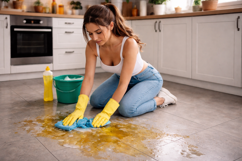 Одна капля масла может превратить кухню в каток. Просто вытереть её тряпкой — ошибка: жир только размажется, сделав пол ещё более скользким и опасным.