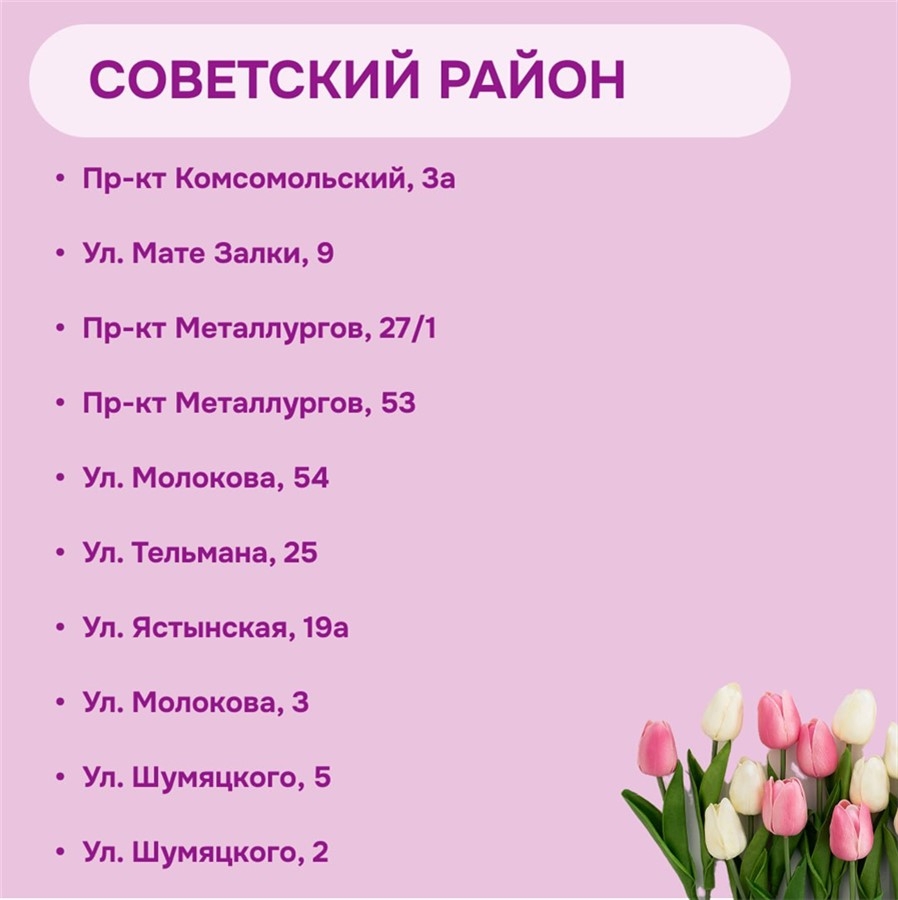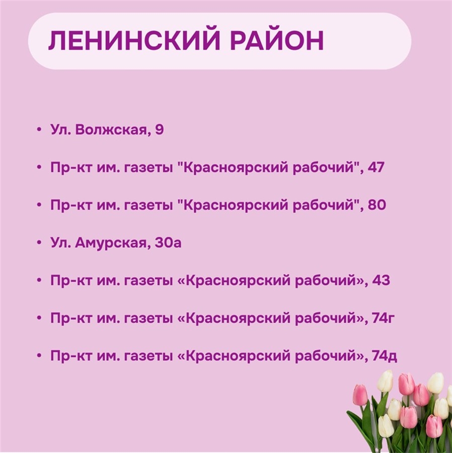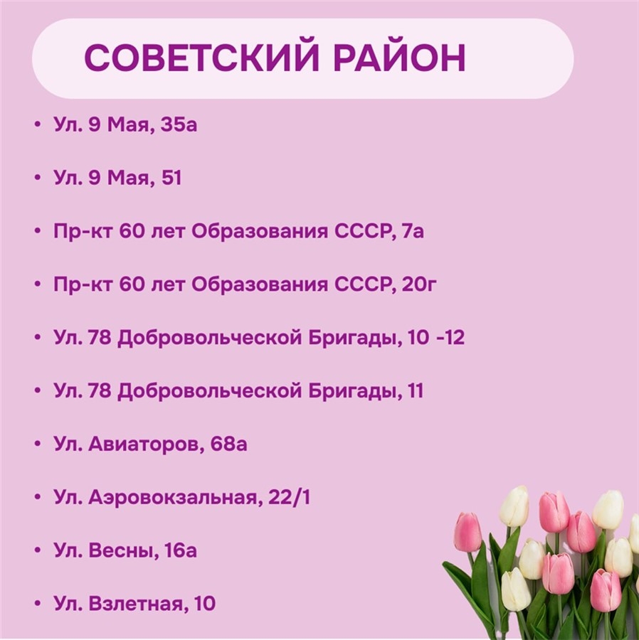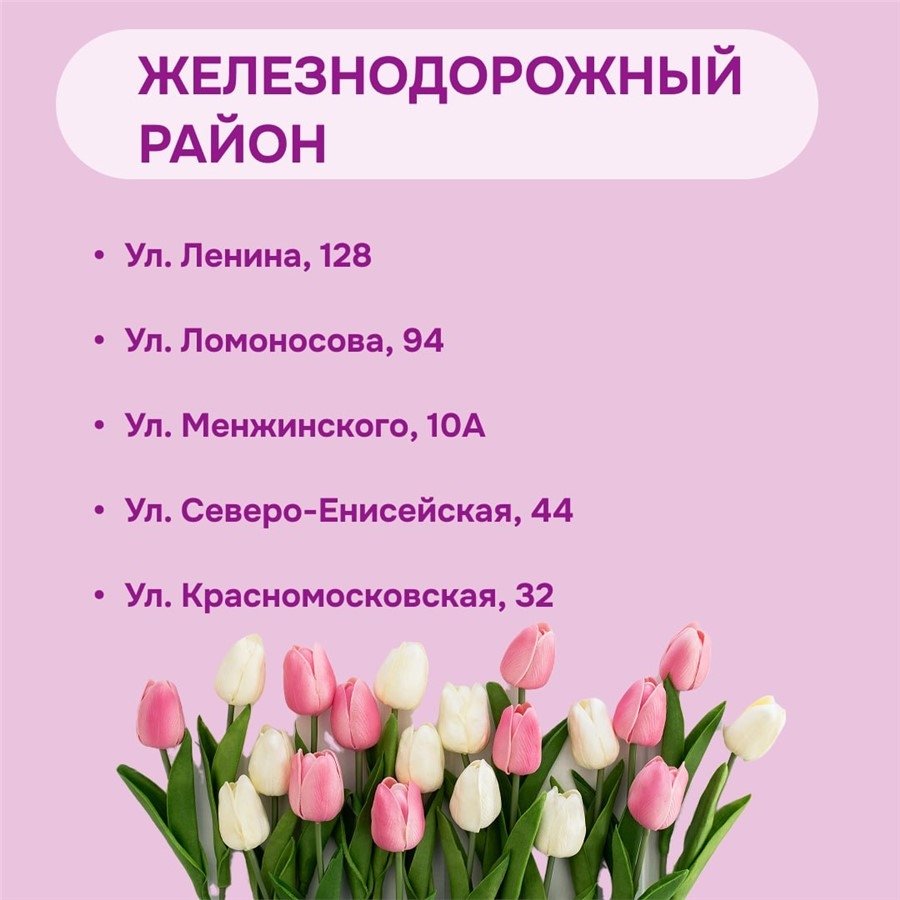 KrasnoyarskMedia, 5 марта. В Красноярске утвердили места для официальной продажи тюльпанов к 8 Марта. Как сообщили в мэрии, торговые точки будут организованы во всех районах города и в праздничные дни будут проходить рейды для выявления незаконных мест торговли.