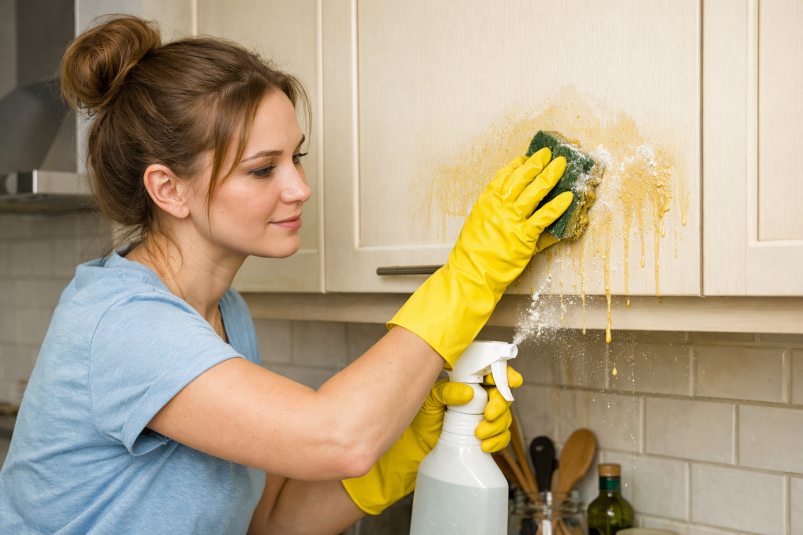 Липкая плёнка на кухонных фасадах — частая проблема на кухне. Во время готовки мельчайшие частицы жира поднимаются вместе с паром и оседают на мебели. Со временем они окисляются, смешиваются с пылью и образуют плотный налёт. Обычная вода или слабый мыльный раствор с такой плёнкой справляются плохо.