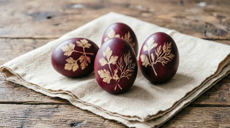 После окрашивания достаньте яйца, снимите зелень и дайте высохнуть. Для блеска можно натереть их каплей растительного масла. Получатся изысканные бордовые яйца с природными узорами — просто, красиво и без химии.