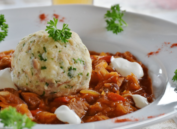 - Подавайте гуляш с пюре из запечённого картофеля, посыпанным мелко нарубленной петрушкой.