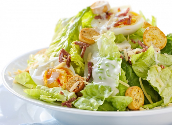 Вот и все! Прекрасный праздничный салат готов. Компоненты в нем похожи на те, что используются в "Цезаре", но салат совершенно другой по вкусу — нежный, сочный, насыщенный. Приятного аппетита!
