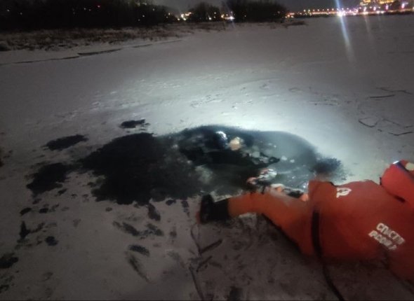 Так как лёд в этом месте очень тонкий, спасатель надел гидрокостюм и ползком подобрался к полынье. Он вытащил тело погибшего и передал его полиции.