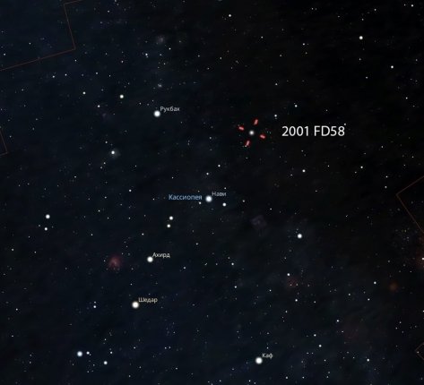 Астероид 162882 (2001 FD58) пролетит мимо нашей планеты на расстояние около 6,5 млн км, что в 17 раз дальше, чем до Луны. Он будет находиться в созвездии Кассиопеи. Экваториальные координаты на 21:00: α = 01h:11m:00s, δ = +63°:18":07″. Как раз это удобное время для наблюдений.