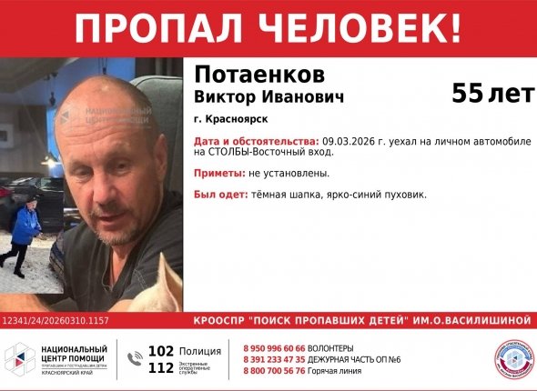 Виктор Потаенков 9 марта уехал на личном автомобиле на "Столбы" — Восточный вход, рассказали в КРОО СПР "Поиск пропавших детей" им. Оксаны Василишиной.