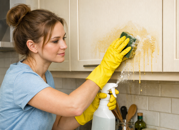 Липкая плёнка на кухонных фасадах — частая проблема на кухне. Во время готовки мельчайшие частицы жира поднимаются вместе с паром и оседают на мебели. Со временем они окисляются, смешиваются с пылью и образуют плотный налёт. Обычная вода или слабый мыльный раствор с такой плёнкой справляются плохо.