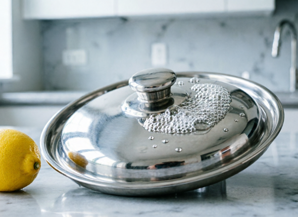Оставьте на 5 минут, затем тщательно смойте теплой водой и насухо протрите микрофиброй. Для стойкого эффекта в конце натрите поверхность половинкой лимона, чтобы убрать остатки жира и придать крышкам ослепительный блеск.